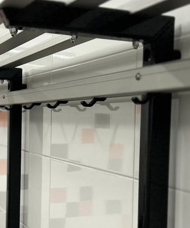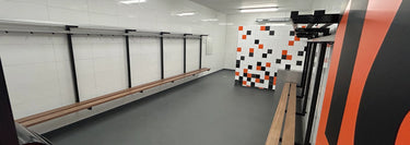 De praktische jashaken en tassenplanken zorgen ervoor dat spelers hun spullen netjes kunnen opbergen. Zo blijft de kleedkamer overzichtelijk en oogt deze altijd opgeruimd. Het resultaat is een kleedruimte die zowel comfort als professionaliteit uitstraalt. Een plek waar spelers zich thuis voelen en kunnen voorbereiden op de wedstrijd.