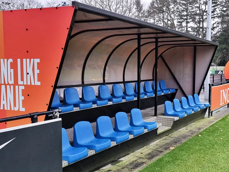 - Uitstraling: een stadion dugout is meer dan een functionele bank. Het is een verlengstuk van de clubidentiteit. Het design moet naadloos aansluiten bij de stijl en uitstraling van het stadion. Hoe beter de dugout past bij de huisstijl en sfeer van de club, hoe sterker en professioneler de totale beleving wordt.