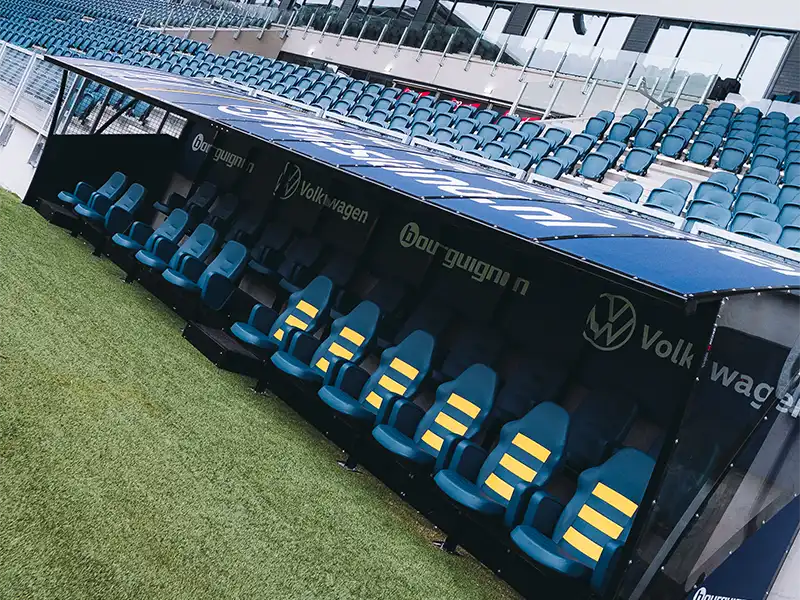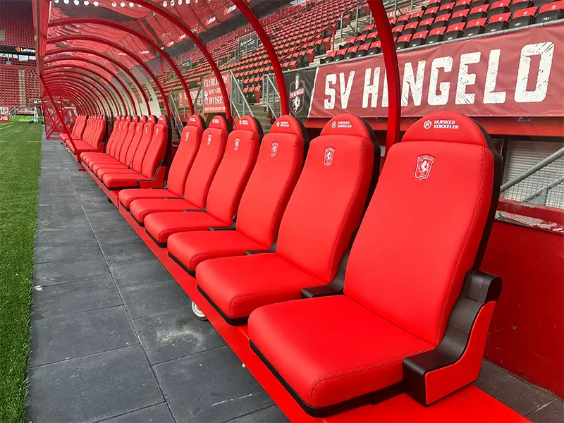 Tot slot speelt uitstraling een belangrijke rol. Een stadion dugout moet naadloos aansluiten bij de stijl en identiteit van de club. Dit vraagt om maatwerk en een andere werkwijze dan bij standaard dugouts. Van de vorm van het frame tot de afwerking van de stoelen. Elke dugout wordt ontworpen en geproduceerd in lijn met de uitstraling van de club en het stadion.