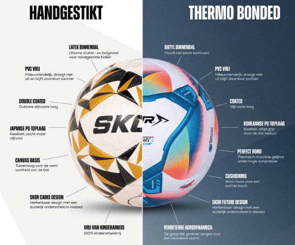 Binnen het assortiment van SKOR wordt onderscheid gemaakt tussen handgestikte voetballen en thermo bonded (hybride) voetballen. Elk type heeft specifieke eigenschappen die invloed hebben op het speelgevoel, de vormvastheid en het onderhoud van de bal.