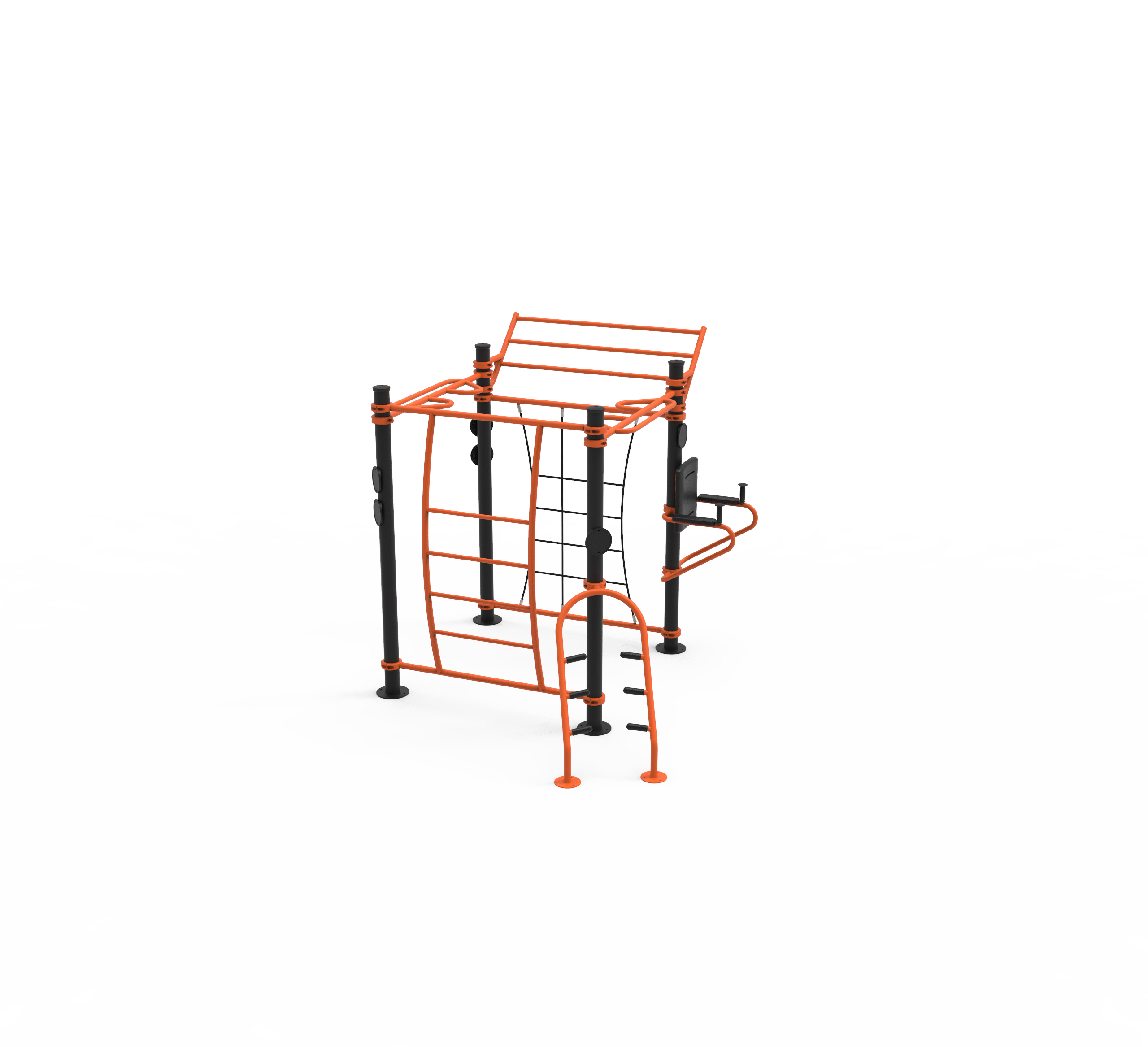 - Uitgevoerd met geïntegreerde monkey bars, klimnet, ladderframes en dipstation